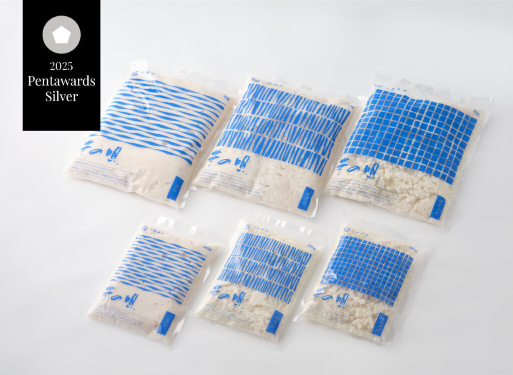 業務用の長芋製品(すりおろし・さいの目切り・千切り)は、用途の違いがひと目で伝わるよう、カットごとの形や質感を表現したスタイライズされたイラストでデザインされています。従来は3種類すべてが同一パッケージであったため識別しにくいという課題がありましたが、新デザインでは視認性と使いやすさを両立。業務用としての機能性を保ちながら、素朴で安心感のあるブランドイメージを表現しています。
